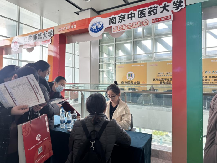 在淮海科技城会展中心举办的徐州市高校招生会上,我校展位吸引了众多考生及家长驻足咨询。招生团队通过发放宣传资料、一对一答疑等方式,全方位展示了我校的办学实力与育人成果,进一步提升了南京中医药大学在徐州地区的知名度和影响力。