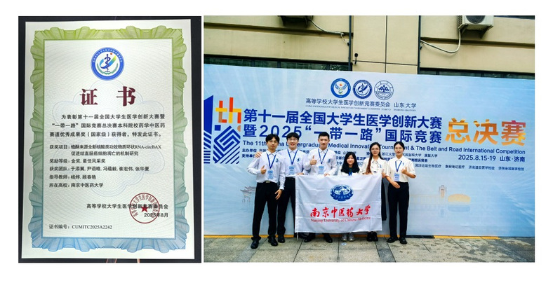 2025年8月,在第十一届全国大学生医学创新大赛暨“一带一路”国际竞赛中,杨烨、顾春艳教授指导以我院临床医学本科生为主导(团队成员:于添翼、尹语晗、冯蕴毅、崔宏伟和张华夏)的团队项目《蟾酥来源环状RNA-circBAX促结直肠癌细胞凋亡机制研究》斩获药学中医药赛道国家级金奖并获得最佳风采奖。该研究综合运用多组学分析技术,成功揭示传统中药蟾酥的新型抗肿瘤机制,创新性发现环状RNA-circBAX的关键调控作用,为结直肠癌精准治疗提供了全新的潜在治疗靶点。