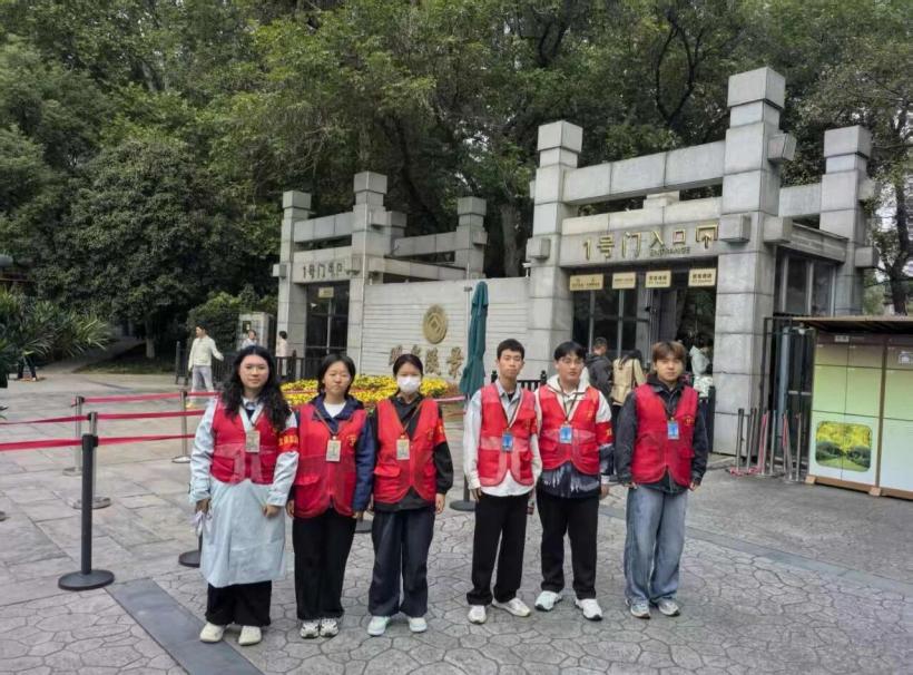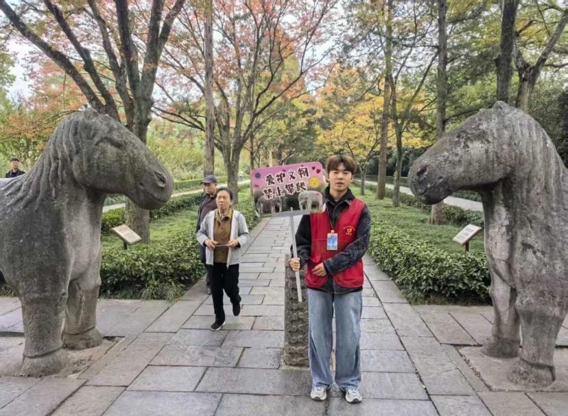 在明孝陵“最美600米石象路”的秋日胜景里,一群身着红马甲的身影成为了历史与文明的桥梁——他们是医学院青年志愿者协会的志愿者,正以行动践行着“守护文物、文明引导”的使命。
