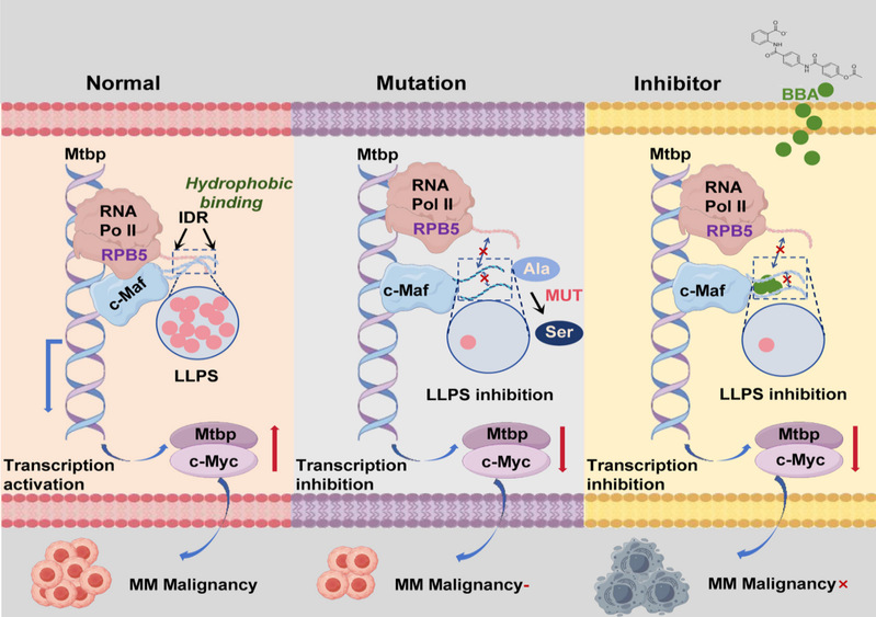2025年11月12日,南京中医药大学杨烨/顾春艳教授课题组在MedComm期刊(中科院一区/JCR Q1,IF:10.7)在线发表题为“Targeting the Liquid–Liquid Separation Region of c-Maf for Treating Chromosomal Translocations in Multiple Myeloma”的研究论文。多发性骨髓瘤(MM)是一种难以治愈的血液肿瘤,转录因子c-Maf不仅频繁参与MM相关的染色体易位,其自身亦具备发生液-液相分离(LLPS)的能力。尽管c-Maf因其转录因子特性长期被视为“不可成药”靶点,本研究提出干预其LLPS过程作为治疗新策略。通过系统的体内外实验证实,c-Maf可经由LLPS形成生物凝聚体,进而促进肿瘤进展。在机制层面,c-Maf的固有无序区(IDR)驱动相分离,并招募RNA聚合酶II,激活Mtbp/c-Myc信号通路。研究发现苯甲酰苯甲酸(BBA)可靶向结合c-Maf的IDR,破坏其LLPS过程,从而阻断RNA Pol II募集及Mtbp/c-Myc信号激活,有效抑制MM进展。该研究不仅揭示了c-Maf通过LLPS机制激活c-Maf/RNA Pol II/Mtbp/c-Myc信号轴推动肿瘤发生,同时验证了靶向相分离策略在治疗染色体易位相关MM中的潜在应用价值。