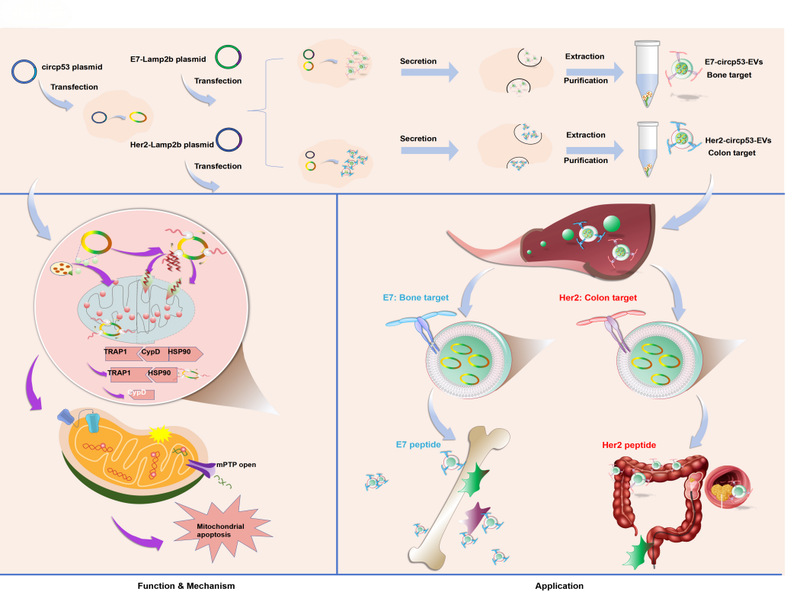 2025年8月1日,医学院杨烨/顾春艳教授课题组的研究论文在Experimental & Molecular Medicine(中科院一区/JCR Q1,IF:12.9)期刊在线发表,题为“Extracellular vesicle-mediated delivery of circp53 suppresses the progression of multiple cancers by activating the CypD/TRAP/HSP90 pathway”。该研究基于环状RNA(circRNA)在肿瘤治疗中的巨大潜力,聚焦于抑癌基因TP53的环状形式circp53(hsa_circp53_0041947),深入探索其在多种癌症中的治疗机制与递送策略。研究发现,circp53编码的功能肽circp53–209aa可独立于p53突变状态发挥作用,通过结合亲环蛋白D(CypD)并破坏CypD/TRAP1/HSP90复合物,从而激活CypD的异构酶活性,诱导线粒体通透性转换孔(mPTP)开放,最终启动线粒体凋亡通路,有效抑制肿瘤细胞增殖。同时,为提升circp53的靶向递送效率,团队开发了两种工程化细胞外囊泡(EV)系统——E7-Lamp2b-EVs和Her2-Lamp2b-EVs,该系统能高效递送circp53至病变部位,显著抑制MM和CRC肿瘤生长,并与化疗药物协同增强抗肿瘤效应。这一突破性成果拓展了circRNA在肿瘤治疗中的应用前景,尤其为TP53突变型等高危难治性癌症提供了潜在的新型治疗手段和理论依据。