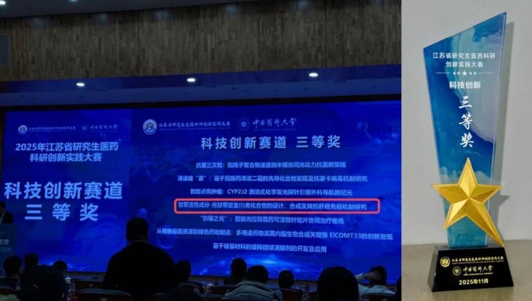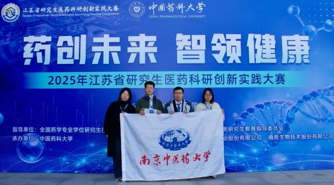 11月29日至30日,2025年江苏省研究生医药科研创新实践大赛(决赛)在中国药科大学江宁校区举办。我院青年教师徐忠仁、刘武昆教授指导,研究生王朝冉、陈琼、王梦诗及熊金昭组建的团队,凭借创新性研究成果从全国175支参赛项目中脱颖而出,成功入围决赛并荣获科技创新三等奖!