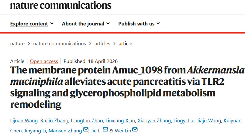 2026年4月18日,南京中医药大学医学院林炜教授团队、南京鼓楼医院感染科李婕教授团队及江苏省中医院章茂森主任团队合作在Nature子刊 Nature Communications 发表题为 “The membrane protein Amuc_1098 from Akkermansia muciniphila alleviates acute pancreatitis via TLR2 signaling and glycerophospholipid metabolism remodeling” 的研究论文。该研究系统阐明了肠道益生菌阿克曼氏菌(Akkermansia muciniphila)来源外膜蛋白 Amuc_1098 调控急性胰腺炎的分子机制,揭示了肠道菌群来源活性分子在消化系统炎症性疾病中的重要调控作用,为急性胰腺炎的干预治疗提供了新的研究思路。