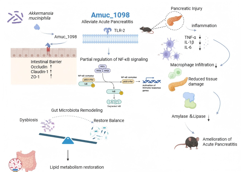 本研究通过构建小鼠急性胰腺炎模型及细胞炎症模型,系统评估了肠道益生菌 Akkermansia muciniphila 来源外膜蛋白 Amuc_1098 在急性胰腺炎中的作用。研究发现,Amuc_1098 补充能够显著减轻小鼠胰腺组织炎症反应及组织损伤,降低炎症因子表达水平,并明显改善肠道屏障功能。机制研究表明,Amuc_1098 可增强肠道紧密连接蛋白表达,降低肠道通透性,同时通过部分调控TLR2/NF-κB信号通路,制炎症反应。此外,多组学分析显示急性胰腺炎小鼠及人群均存在甘油磷脂代谢紊乱,而 Amuc_1098 可通过重塑肠道菌群结构并调节相关代谢通路,从而改善代谢异常并缓解疾病进程。该研究揭示了肠道菌群来源活性蛋白通过调控炎症信号、肠道屏障及脂质代谢共同参与急性胰腺炎调控的新机制,为基于微生物来源分子的疾病干预提供了新的理论依据和潜在靶点。